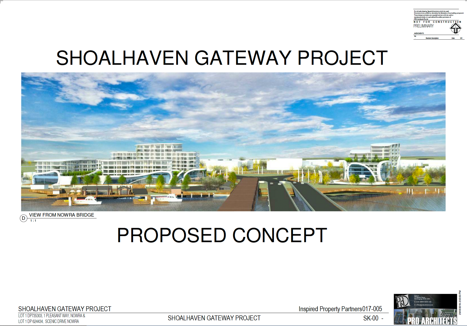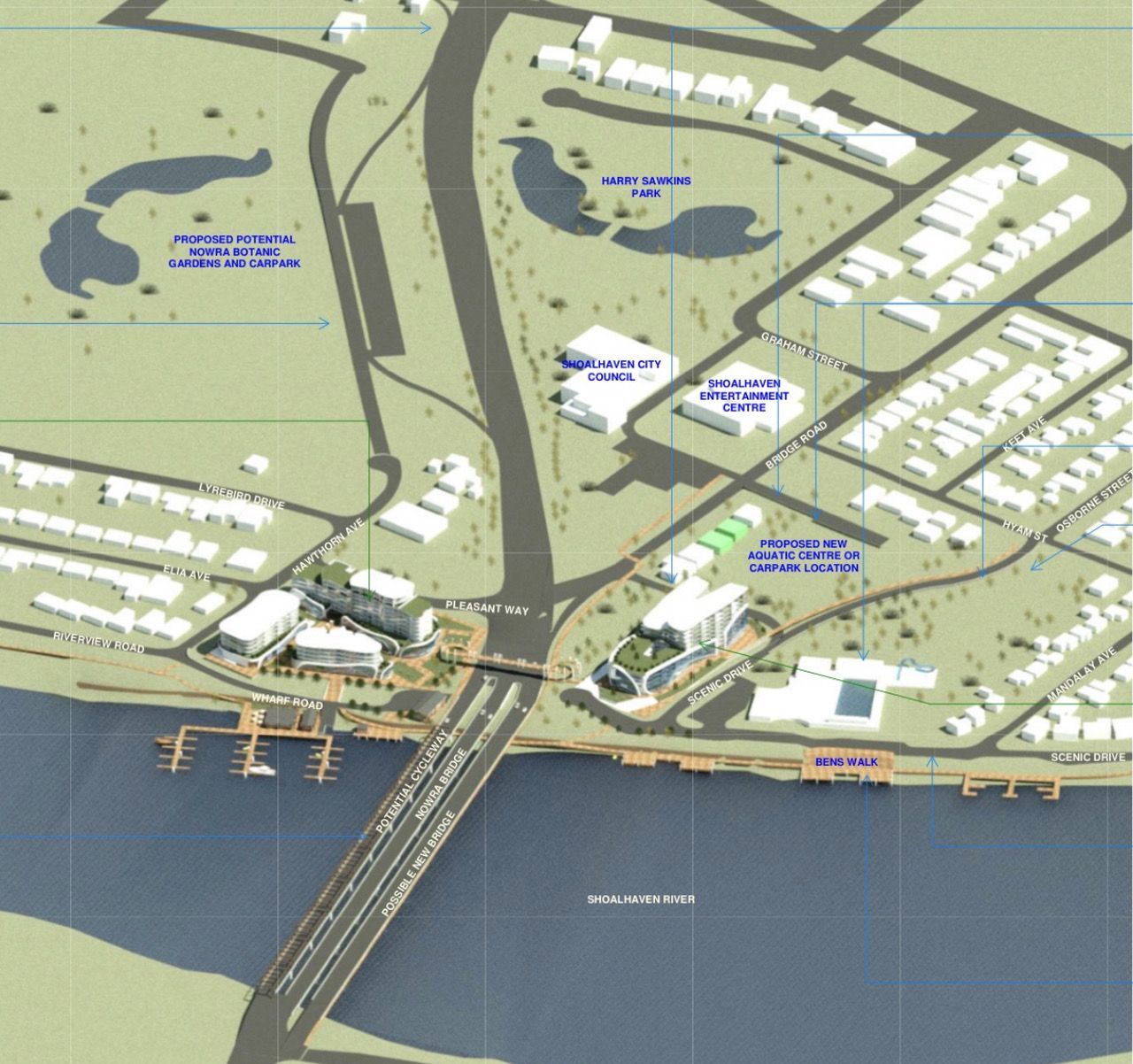 Looking south back towards Nowra CBD, this perspective shares to proximaty to other key aspects of the city plan. Entertainment centre, aqua park, council chambers, CBD and botanic garden site.