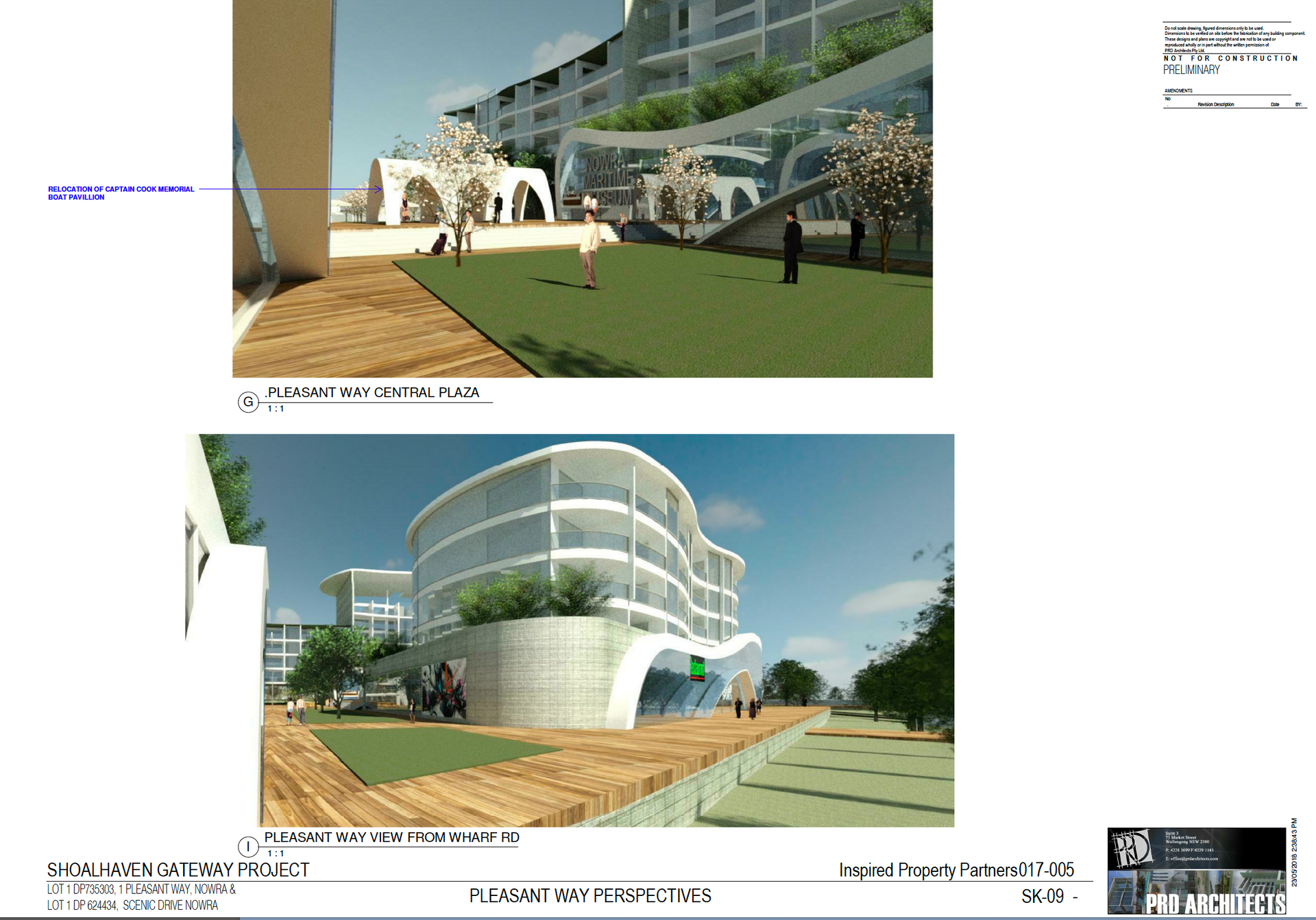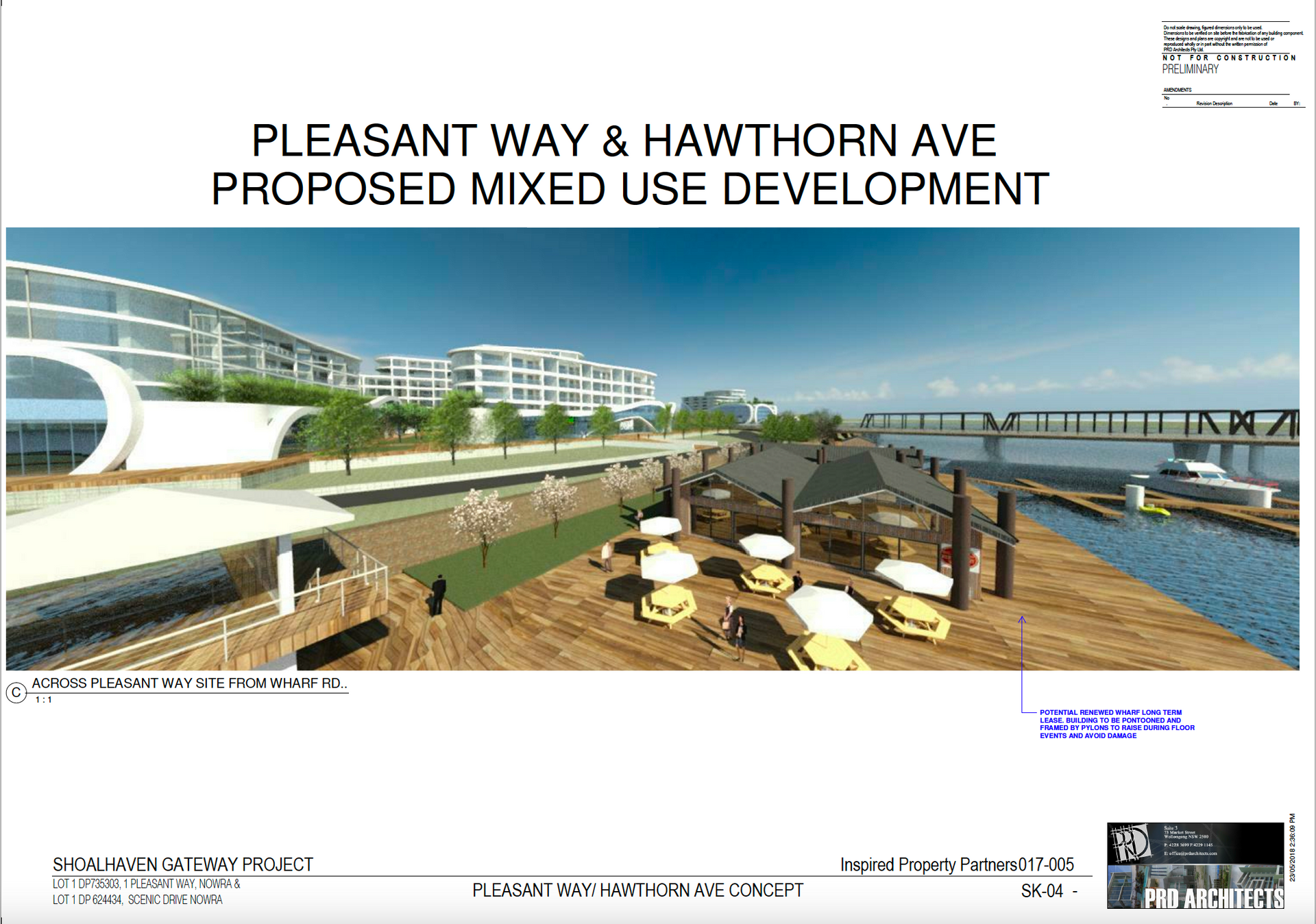 Onlooking the Marina esplanade design, through to the Wharf Rd commercial precinct area, residential and hotel rooms above.